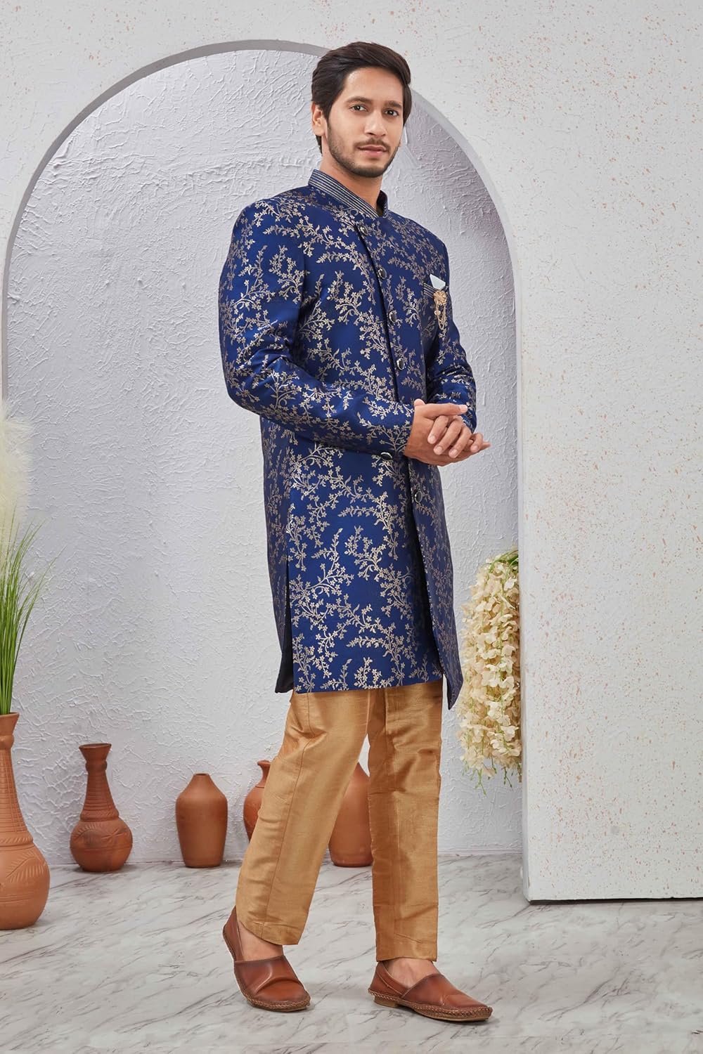 Indian Designer Wedding Festive Wear Jacquard Indo-Western Sherwani Pajama Set For Men