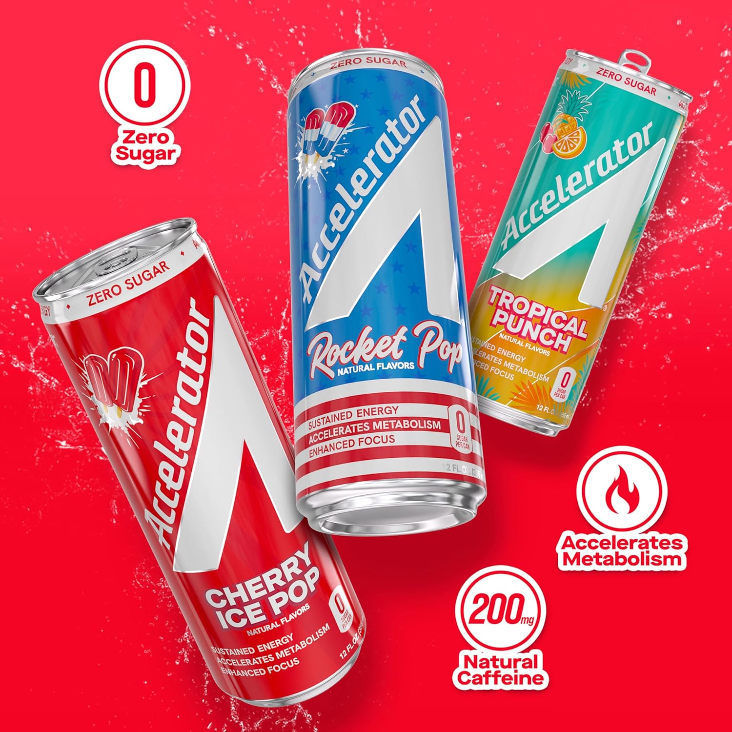 Contains: twelve 12 fluid ounce cans of Accelerator Active Energy Drink, Variety Pack; Three of your favorite Accelerator flavors now available in one 12-Pack; Accelerate Your Day with Rocket Pop, Cherry Ice Pop and Tropical Punch. Accelerator sugar free energy drinks for sustained clean energy that accelerates metabolism and enhances focus