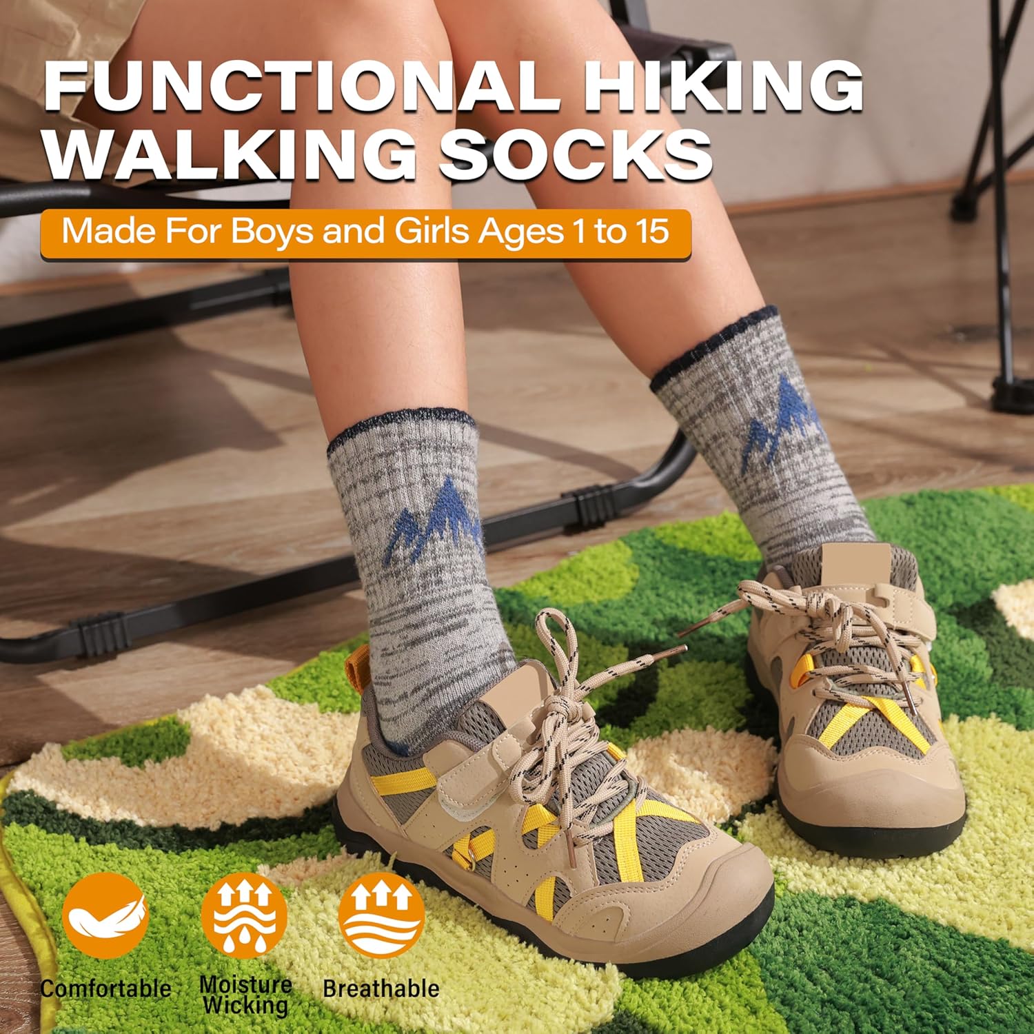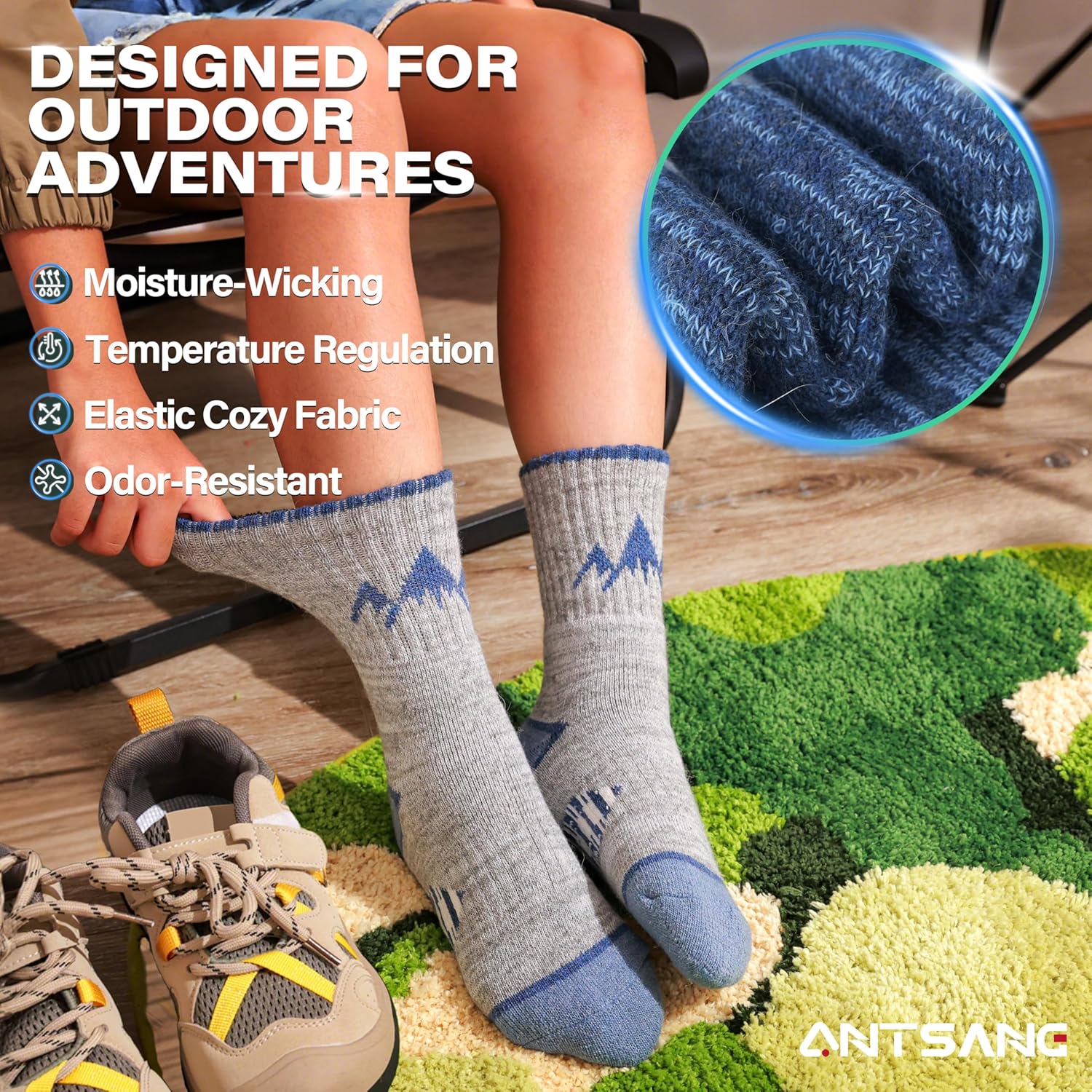 The video showcases the product in use.The video guides you through product setup.The video compares multiple products.The video shows the product being unpacked. ANTSANG Kids Merino Wool Hiking socks Merchant Video
