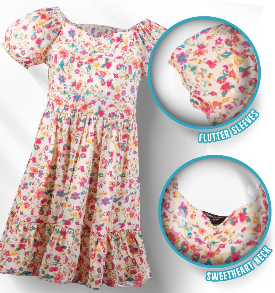 French Connection Girls All Over Print Soft Casual Dress – Flutter Sleeve Ruffle Floral Print Summer Sundress for Kids