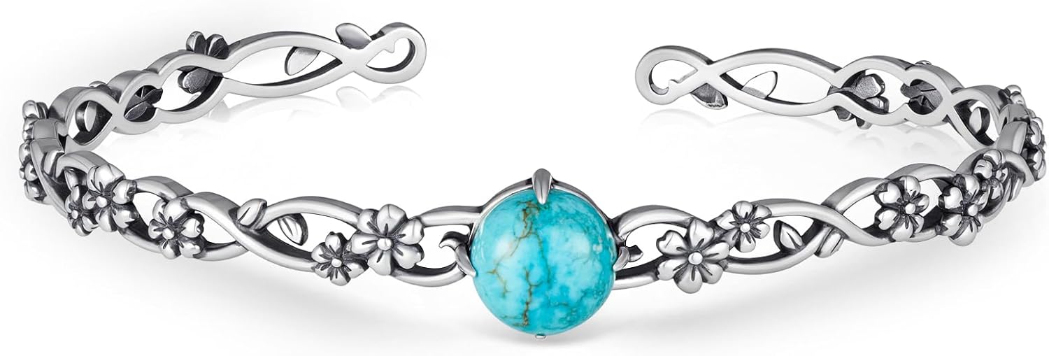 This turquoise bangle cuff features natural turquoise and boho flower design, symbolizing growth and harmony. Inspired by Western heritage, this turquoise bracelet for women captures the beauty of nature and the spirit of the frontier. The real turquoise jewelry add a vibrant touch, making it a standout piece in any western jewelry collection for women.