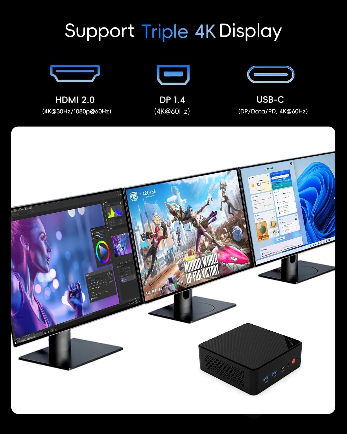 CREATE A TRUE TRIPLE 4K WORKSPACE & MAXIMIZE PRODUCTIVITY – This mini PC supports simultaneous triple 4K display output via USB-C, HDMI 2.0, and DisplayPort 1.4. Effortlessly manage multiple windows for professional workflows like financial trading with live charts, software development, content creation with side-by-side previews, or extensive research