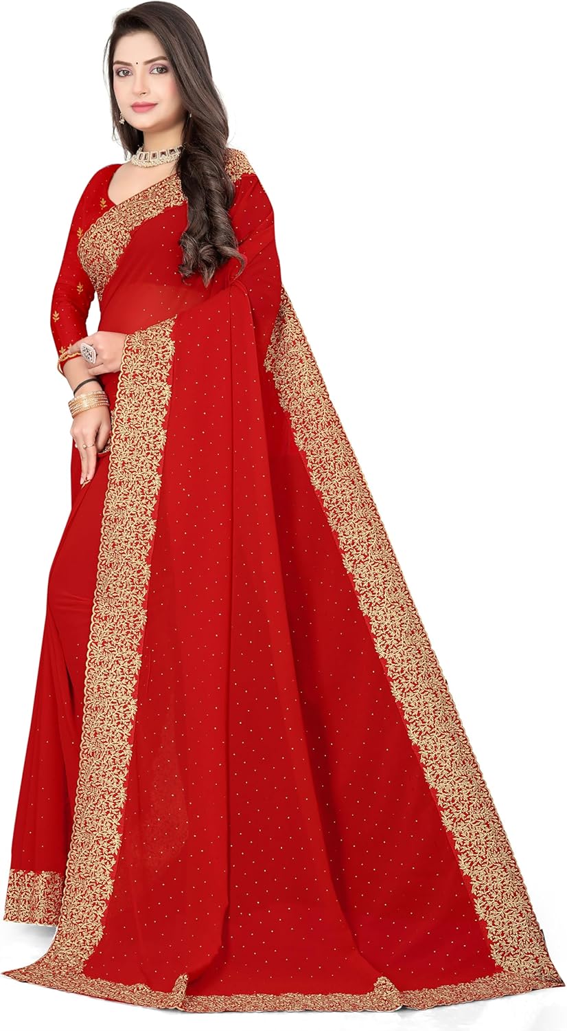 Make a grand festive statement with the Svayi Women’s Georgette Broad Golden Embroidery Saree, crafted to reflect luxury and traditional elegance. This stunning saree features a broad gold floral and vine embroidered border, beautifully enhanced with all-over siroksi-style embellishments for a rich, shimmering finish. Made from premium georgette fabric, it offers a graceful drape and lightweight comfort. The saree is paired with a matching unstitched georgette blouse piece attached at the end, allowing customized stitching as per your style.