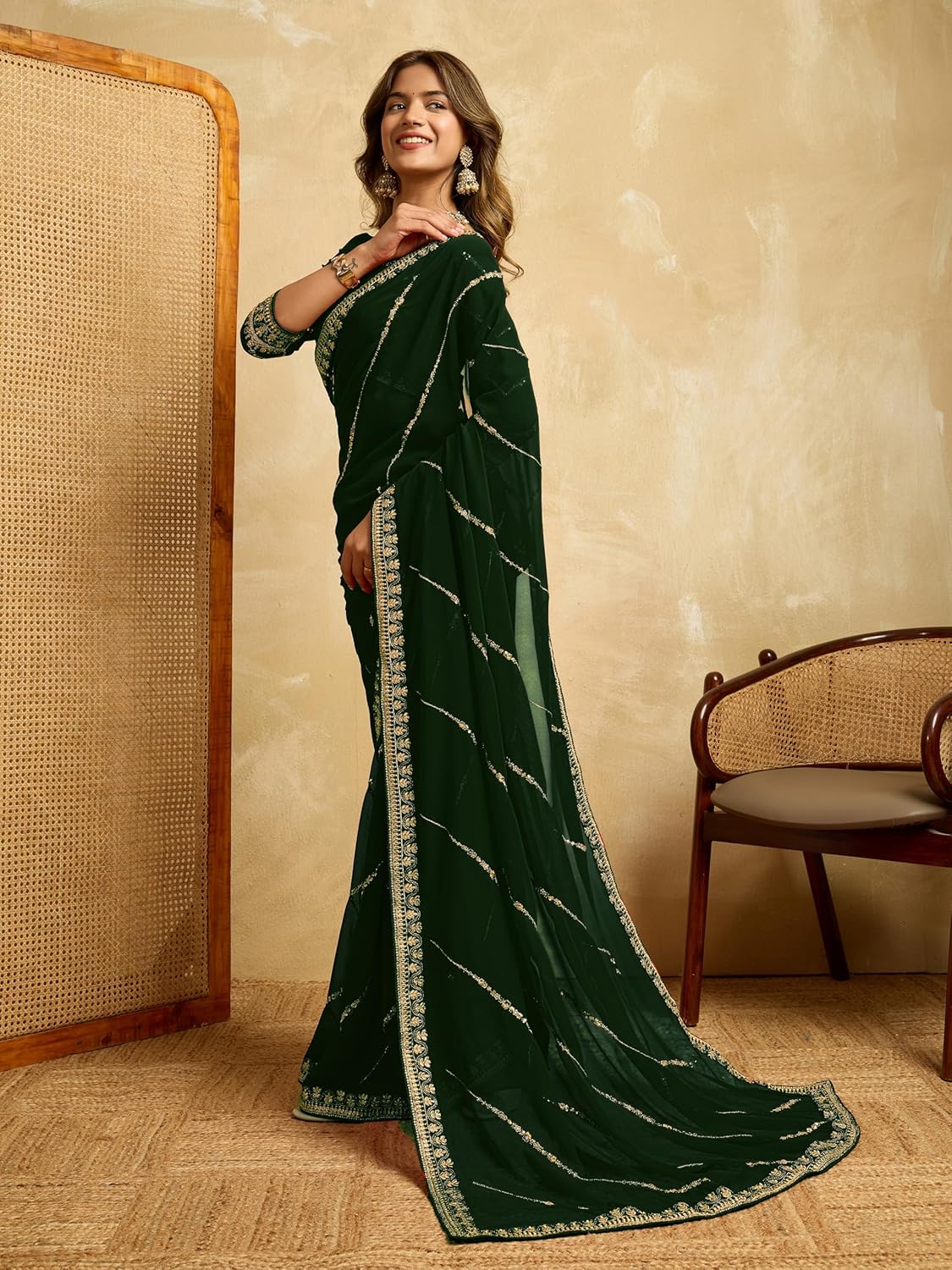 Add refined festive elegance to your wardrobe with the Svayi Women’s Georgette Floral Embroidered Saree, designed with intricate craftsmanship and modern styling. This graceful saree is adorned with gold thread floral and leaf motifs, enhanced by delicate sequin embroidery and all-over embellished diagonal line patterns for a rich, shimmering look. Crafted from premium georgette fabric, it drapes effortlessly and ensures lightweight comfort. The saree comes with a matching unstitched georgette blouse piece attached at the end, allowing custom tailoring as per your preference.