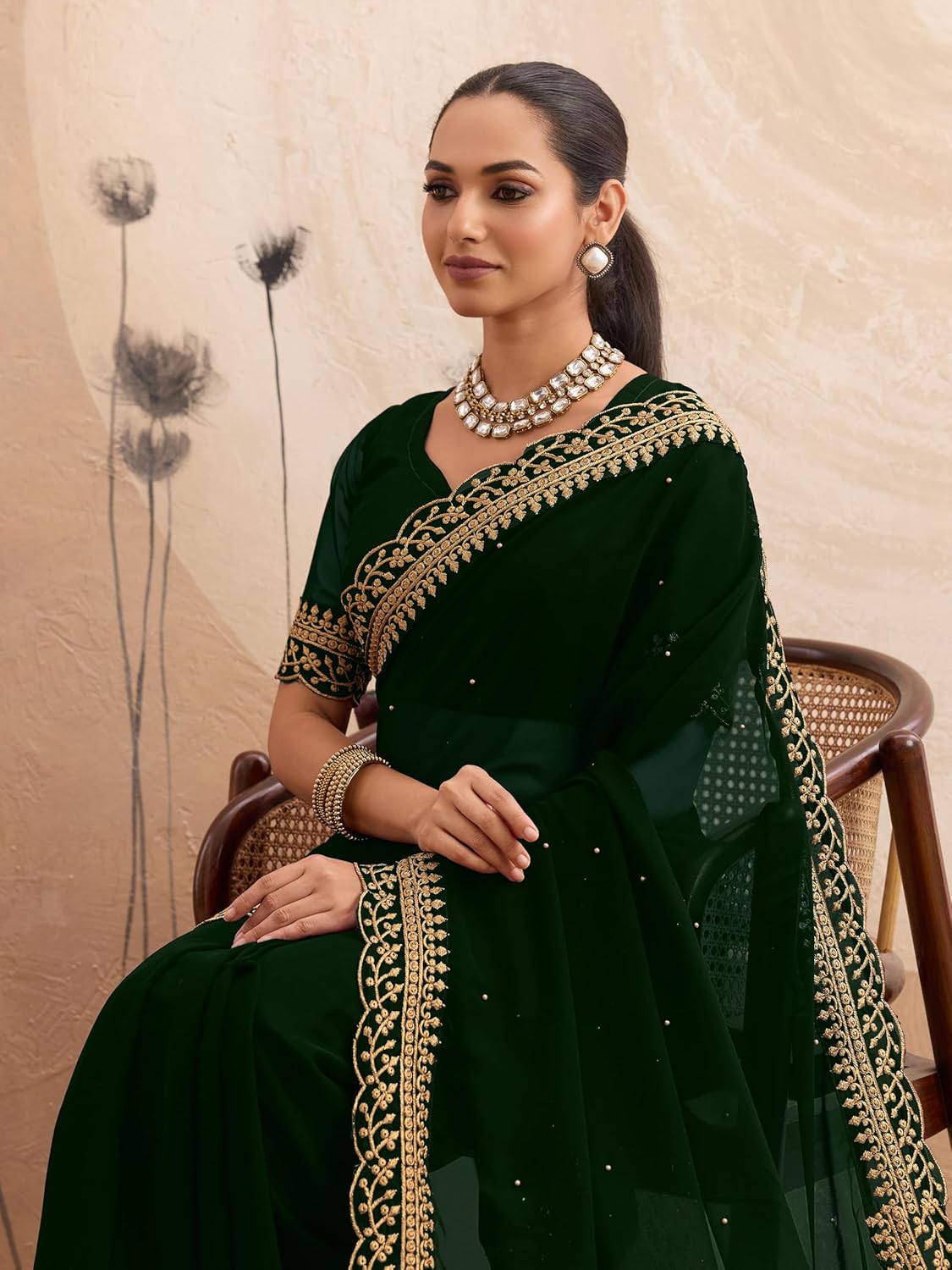 Step into timeless elegance with the Svayi Women’s Georgette Golden Embroidery Saree, beautifully crafted for weddings and festive celebrations. This graceful saree features a rich gold zari floral embroidered border enhanced with subtle all-over pearl bead embellishments, creating a luxurious and refined look. Made from lightweight georgette fabric, it drapes effortlessly and comes paired with a matching unstitched georgette blouse piece attached at the end of the saree for customized stitching. Perfect for weddings, festive events, receptions, and parties, this saree reflects classic Svayi craftsmanship with modern appeal.