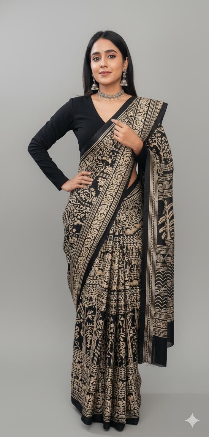 Women’s Art Silk Printed Kalamkari Saree for women With Blouse Piece (Black And Beige)
