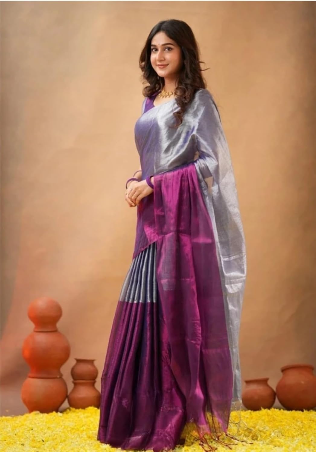 The Raga Cotton Tissue Saree with Blouse Piece is a graceful fusion of comfort and elegance. Made from a premium cotton tissue blend, it combines the breathable softness of cotton with the subtle sheen of tissue threads, creating a lightweight saree ideal for festive and special occasions. Weighing just 300 grams, this saree is easy to drape and carry, making it suitable for weddings, receptions, parties, or cultural events. Its handloom-inspired weave with fine zari tissue interlacing adds a rich, traditional charm, while the semi-transparent texture gives it a modern, graceful appeal. The contrast border and shimmering pallu with elegant tassels further enhance its beauty. Measuring 5.5 meters with an attached 0.8-meter blouse piece, this saree offers a complete ethnic outfit ready to be customized. Whether as a gift or a wardrobe addition, it’s a timeless choice for women who value tradition with contemporary style.